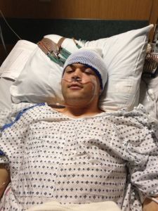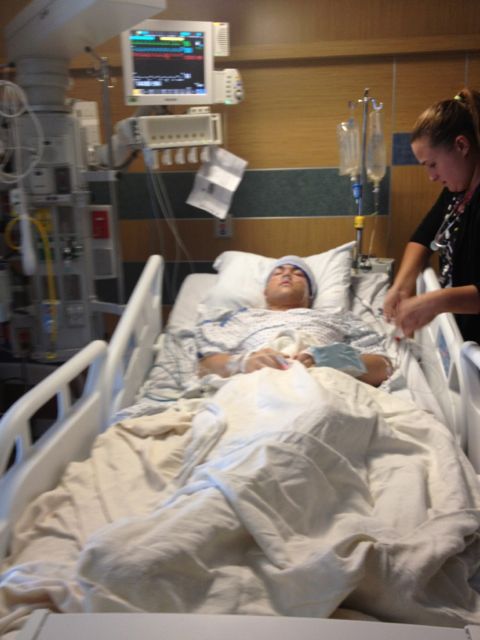 The effects of the anesthesia have caused him to feel nauseous, there are medicines which help with this. Adam has not eaten in a day and a half, he has tried, but the cracker or drink is still making him sick. Last night he threw up; since he can not move his head and body out-of-the-way it went all over… my heart just broke seeing him lay there with everything on him. I tried to clean up as much as I could… called for the nurse but they were slow in arriving.. 5 minutes. We had to change his sheets, gown and blankets.. not an easy task for a big kid like Adam who can’t really move without a lot of pain, then there are the concerns of his head, the wires coming out of his head and all the lines, tubes and needles plugged into him; we had to be careful.