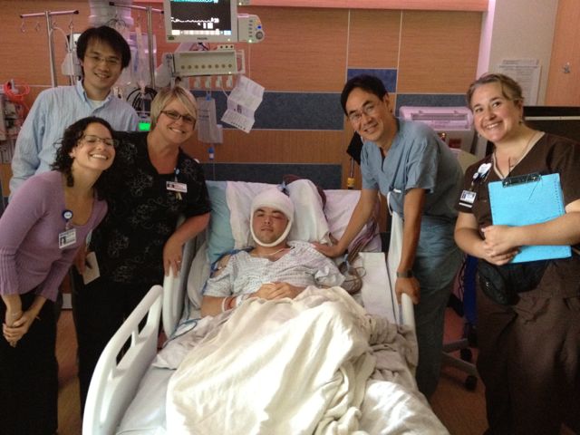 Adam’s right shoulder and arm continue to cause him a good amount of discomfort. There are several thoughts of why he is experiencing pain in this area. One; The  position the doctors had him on the operating table was such that he had his head rolled over and resting on his right side the entire time while they opened up his left side, in addition the tables are very hard and the doctors had something under his back to keep him propped up a little to help their access. Second thought: Adam’s brain might be swelling and causing pressure spots on his brain which in turn would have effects. This might be the most likely as his right hand today was making movements on its own and his fingers would keep going numb.  When he would tell me that his thumb or finger was numb I would put a good amount of pressure on those individual fingers to see if he could feel it, but he could only feel a slight movement, not the pressure. This sensation would come and go throughout the day. Three: His seizures are so violent that he has thrown his shoulder out and damaged the area.  The doctors ordered an x-ray and the tech brought in a portable x-ray machine to take a few pictures of this area. We have not found out the results yet.