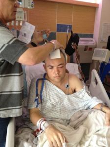 Adam cried out that it needed to stop…meaning the seizures, they needed to stop:  the nurse was trying to get the doctor on the phone for permission to use the medicine to sedate the seizures. Adam was sweating much more by now and wanted to sit up, to allow him to cool off a little. The wires in his head caught the back of the bed and jerked him back a few inches.. he didn’t scream out, didn’t say a bad word.. only a facial expression of pain and stated “please be careful.”  He asked and wanted to know if he had met the requirements for the doctors, meaning did he meet the needed number of seizures… we didn’t know.