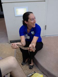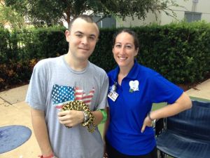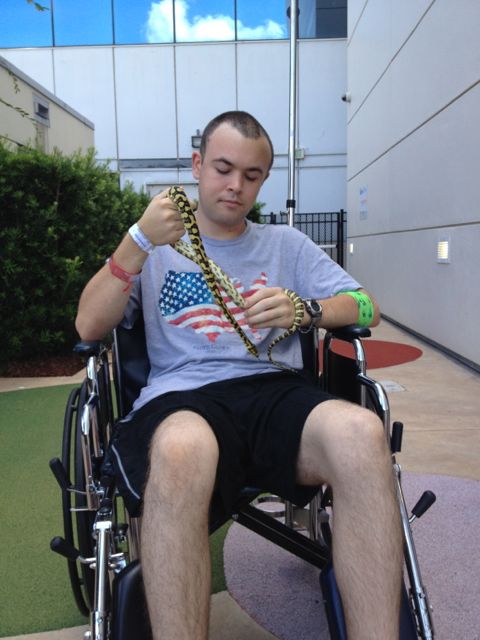 Cindy worked it out a few days prior with Cari to bring two of his snakes in and have us all meet down stairs in the outside resting area…. just off the main lobby of the Disney Pavilion.  It all worked out, Cindy was there with the snakes, Cari and Adam were there in the wheel chair and the show began.
